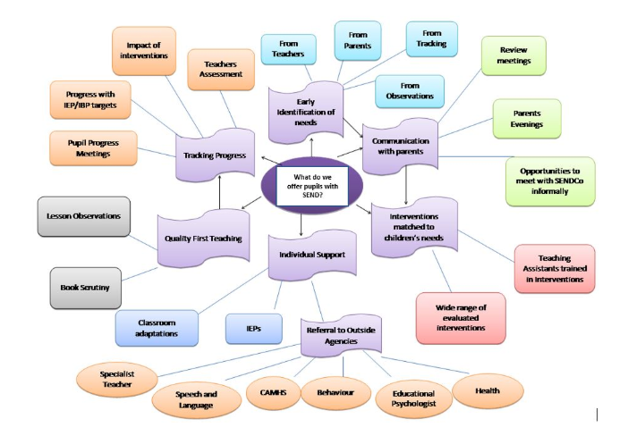 When pupils are Identified as having barriers to learning, the following professionals will liase with you to explain their difficulties. This usually starts with the Class Teacher, who then requests for the SENDCO (Special Educational Needs and Disabilities Co-ordinator) to be involve. Parents/ Carers play a huge role in helping the school understand their children’s needs and guidance might be sort from the previous school or nursery setting, outside agencies and the Senior Leadership team.