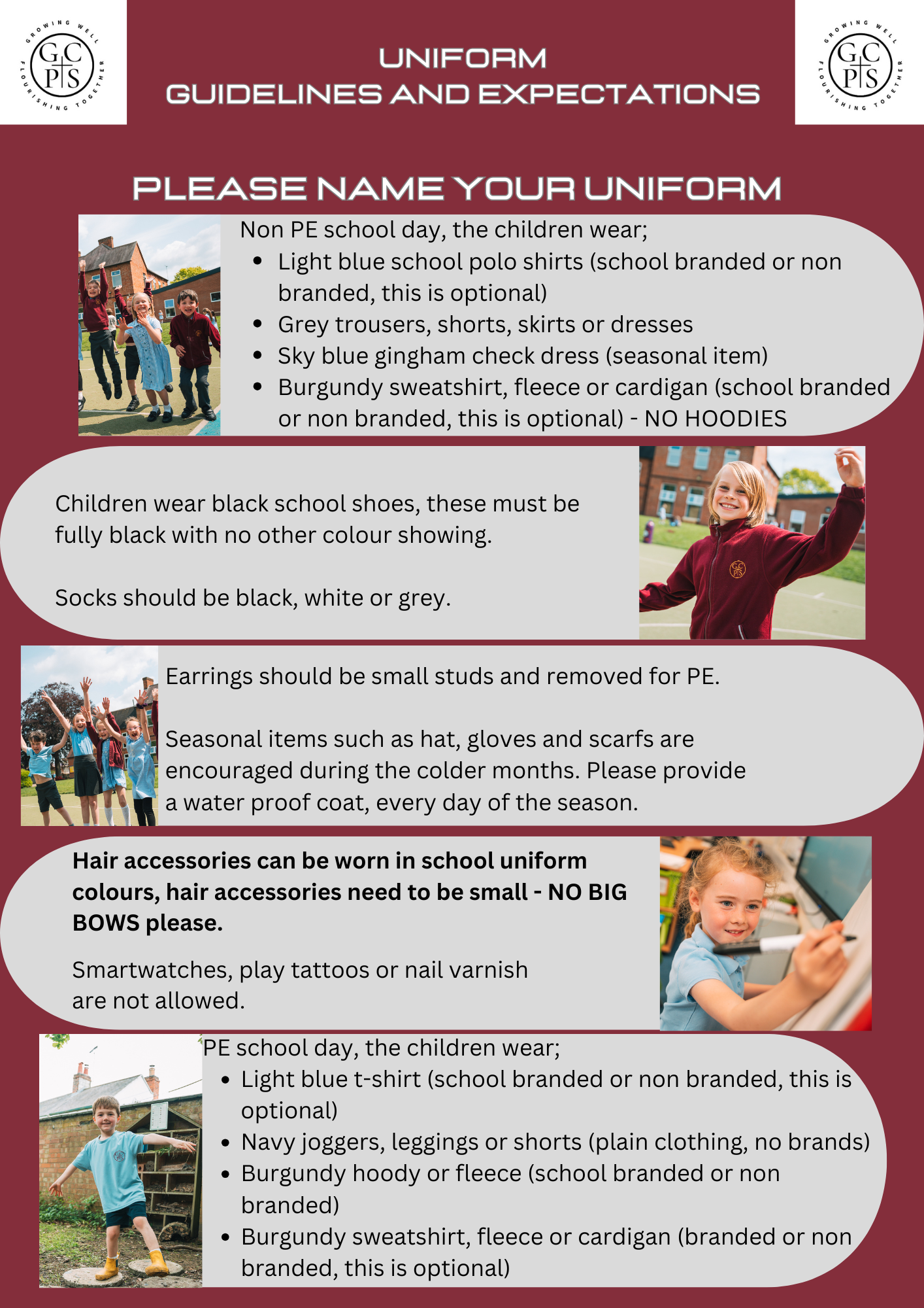 Non logo items, such as grey shorts, light blue school polo shirts, grey pinafore or blue gingham dresses or plain white, grey or black socks, black shoes, etc. may be purchased from any of a range of stores such as Sainsbury, Tesco, M&S, ASDA, etc.